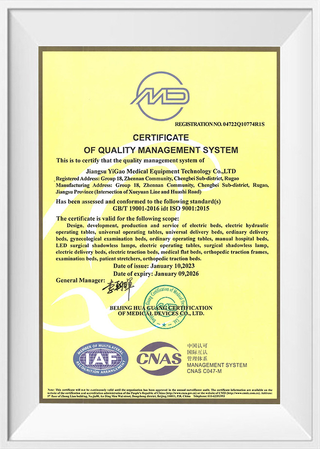 Как предприятие, прошедшее ИСО 9001, ИСО 13485, ИСО 14001, ИСО 45001. и другие сертификаты системы управления, Jiangsu Yigao Medical Equipment Technology Co., Ltd. считает качество продукции своей жизненной силой. Наши операционные столы строго соответствуют стандарты CE Это означает, что они не только отвечают требованиям безопасности, здоровья и окружающей среды европейского рынка, но также представляют ведущий международный уровень в разработке и производстве продукции.